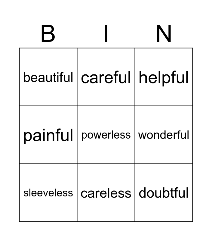 This bingo card has 25 words: Free!, harmless, careless, worthless, powerless, beautiful, wonderful, careful, thankfull, homeless, doubtful, successful, cheerful, thoughtful, sleeveless, joyful, delightful, helpful, painless, penniless, useful, useless, colorful, painful and shameless.