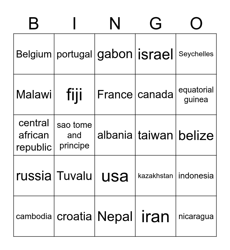 This bingo card has 25 words: Tuvalu, Nepal, France, cambodia, Seychelles, Belgium, Malawi, portugal, taiwan, usa, canada, central african republic, kazakhstan, indonesia, fiji, nicaragua, belize, gabon, equatorial guinea, sao tome and principe, albania, croatia, russia, israel and iran.