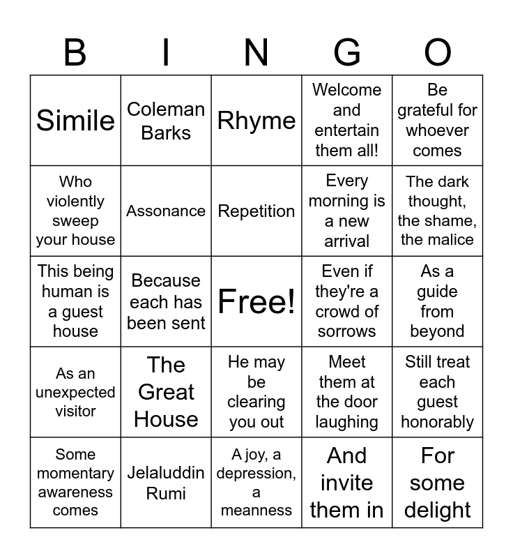 This bingo card has a free space and 24 words: The Great House, Jelaluddin Rumi, Repetition, Some momentary awareness comes, Be grateful for whoever comes, Simile, Who violently sweep your house, Coleman Barks, Even if they're a crowd of sorrows, He may be clearing you out, Every morning is a new arrival, This being human is a guest house, Meet them at the door laughing, Still treat each guest honorably, Assonance, And invite them in, As a guide from beyond, Rhyme, The dark thought, the shame, the malice, Because each has been sent, For some delight, As an unexpected visitor, Welcome and entertain them all! and A joy, a depression, a meanness.