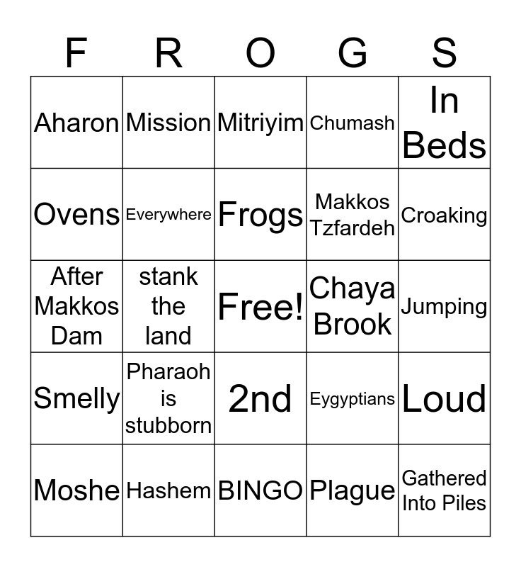 This bingo card has a free space and 24 words: Pharaoh is stubborn, Hashem, Frogs, Moshe, In Beds, Aharon, Ovens, Mission, Chaya Brook, 2nd, Makkos Tzfardeh, After Makkos Dam, Eygyptians, Loud, Everywhere, Plague, Jumping, Mitriyim, Croaking, stank the land, Gathered Into Piles, Smelly, Chumash and BINGO.