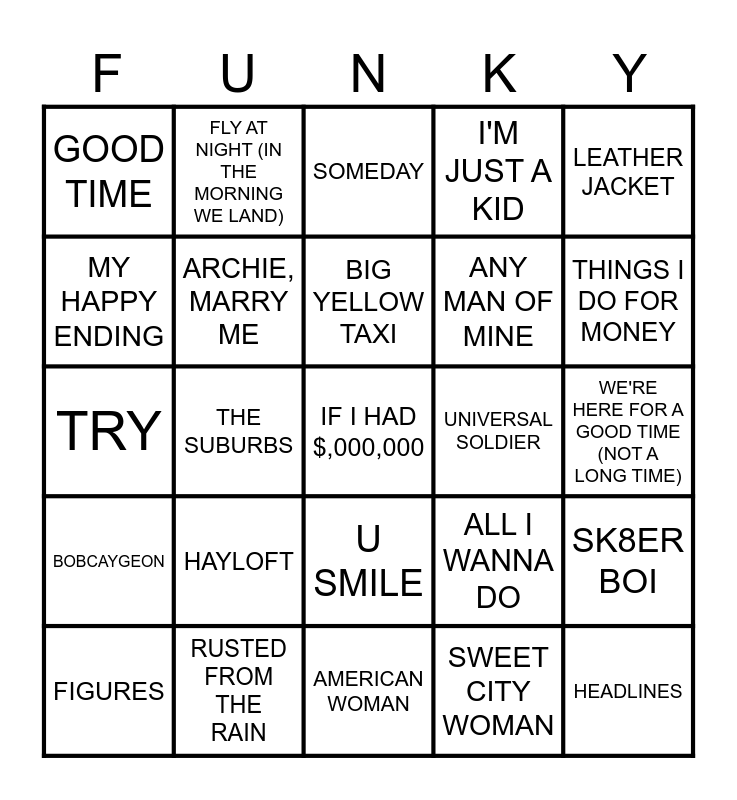 This bingo card has 75 words: HOW YOU REMIND ME, PHOTOGRAPH, SOMEDAY, CHILLS, WHAT I WOULDN'T DO, SUMMER OF '69, SO LONG, MARIANNE, LIFE IS A HIGHWAY, LONG TIME RUNNING, HEAVEN, HEADLINES, WHAT DO YOU MEAN?, BIG YELLOW TAXI, MY HAPPY ENDING, HEART OF GOLD, THE SUBURBS, ONE WEEK, IF I HAD $,000,000, BRIAN WILSON, LEATHER JACKET, 5 DAYS IN MAY, TRY, ARCHIE, MARRY ME, FLY AT NIGHT (IN THE MORNING WE LAND), I'M JUST A KID, WORKING FOR THE WEEKEND, THE KID IS HOT TONITE, ROBSON GIRL, THE WEIGHT, SUNGLASSES AT NIGHT, SHE AIN'T PRETTY, TOM SWAYER, SUNDOWN, ALL I WANNA DO, THINGS I DO FOR MONEY, ANY MAN OF MINE, BLAME BRETT, I'M ALIVE, WE'RE HERE FOR A GOOD TIME (NOT A LONG TIME), SWEET CITY WOMAN, YOU OUGHTA KNOW, THE HOCKEY SONG, HOME FOR A REST, PEACH PIT, HALLELUJAH, BUILDING A MYSTERY, FIGURES, GOOD TIME, DRIVE MY SOUL, CLOSER, ALONE AGAIN, U SMILE, HOME, FEELING GOOD, IN TOO DEEP, OCEAN PEARL, LOVIN' EVERY MINUTE OF IT, POETS, CHANCELLOR, BROTHER DOWN, HAYLOFT, WHEN U LOVE SOMEBODY, HELLO TIME BOMB, STARBOY, I'M LIKE A BIRD, UNIVERSAL SOLDIER, ELECTRIC POW WOW DRUM, JAPANESE DENIM, HOLD ON, WE'RE GOING HOME, SK8ER BOI, BOBCAYGEON, RUSTED FROM THE RAIN, THE BOYS IN THE BRIGHT WHITE SPORTS CAR, AMERICAN WOMAN and YOU"RE STILL THE ONE.