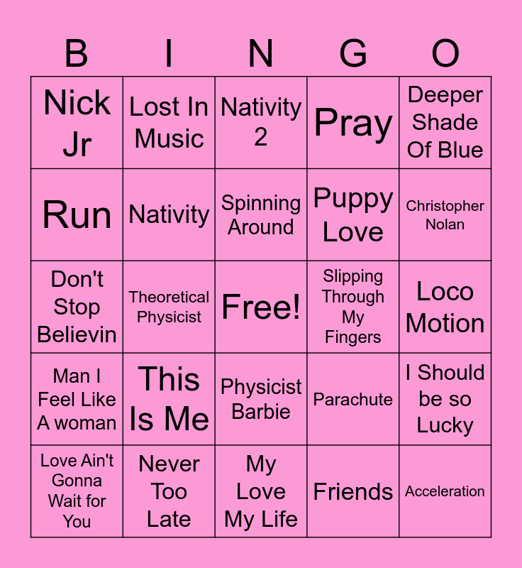 This bingo card has a free space and 362 words: Piggy - Jo and me, Super Trouper, Summer - me and Rachel, 25. The summer dances - everyone, Goodbye, Tears, Little Me, With Ur Love, Here and Now, Steady and Slow, Drag Me Down, Chiquitita, Grace Kelly, Could It Be Magic, Story Of My Life, 41. KC's lullaby - me and Rachel, Disney Junior, 8. Count on Us - Flo and Hannah, CBBC, Story Of A Heart, Back to Black, Spice Up Your Life, Patience, Sound Of The Underground, Love at first sight, 53. Hot hot lava - me and Gio, 54. I've got pizzazz - me and Louise, 14. Minnie's boutique - me and Elaine, Bop To The Top, Midnight Memories, Angel Eyes, Unpredictable, Say You'll Be There, Back For Good, Dancing Queen, Never Too Late, Do They Know It's Christmas, Venus, Spinning Around, More Than Friends, Let Me Entertain You, Relight My Fire, The Loving Kind, I Know him so well, Kermit, Best Song Ever, History, Hair, Nativity, What Makes You Beautiful, 38. Make some noise - Grace and me, Jump, What Makes You Beautiful, Out Of Our Heads, Cha Cha Slide, 18. Princess things - me and Beckie, Raining Sunshine, Roar, Oops I Did It Again, Footprints in the sand, Good Mood, Promise This, 44. Never land pirate band - Gio and Beckie, Lush Life, Does Your Mother Know, My Love My Life, Waterloo, CITV, Sweet Child O Mine, Call Me, 35. The clubhouse birthday party - James and Melissa, 50. Weather - me and Flo, Can't Get You Out Of My Head, Heartbreak In This City, The Scientist, 27. Bringing this baby home - Rachel and Brandon, PJ Masks, Stop, Music, Tiger Feet, One Way or Another (Teenage Kicks), Summer's Lullaby, Neon Blue, Titanium, 24. PJ masks and feeling great - Pete and Andy, Gonzo, Nativity 2, Family, Hallelujah, 3. Training - Rachel and Me, Perfect, Night Is Young, Last Thing On My Mind, 16. Mousekadoer - James and Me, Pack Up, Heart Skips a Beat, Wannabe, Why Did It Have To Be Me, I Think Were Alone Now, Wake Me Up, Smile Please, I've Been Waiting For You, Lost In Music, All About The Bass, Step Back In Time, Nothing Scares Me, Something Kinda Ooh, 11. Everyday fun - Beckie and Me, Shackles, Somewhere Only We Know, Dancing On Ice, Love Ain't Gonna Wait for You, 48. Hello Christmas - me and Rachel, Paw Patrol, Nick Jr, Hero, Mama, A Moment Like This, Scared of the Dark, Kids, Set Fire To The Rain, 1. Hot Dog - James and Melissa, Stomp, Yoga, 28. A bicycle built for two - James and Brandon, Lipstick, Never have to say goodbye, Two In A Million, Heartbeat, The New Pup, Summer Of Love, Live While Were Young, One For Sorrow, When You're Gone, When All Is Said and Done, Puppy Love, Bring It All Back, I Believe in You, Milkshake, Run, Start up your imagination, Penguin with A Plan, St Trinians, Untouchable, I Do I Do I Do I Do I Do, Steady and Slow, Geno, Mamma Mia, Pretend, SOS, No More Tears Enough, Amazing Machines, Honey Honey, The Promise, Fight For This Love, 4. Seasons - Rachel and Andy, Lazy Song, Our Last Summer, The Masked Singer, Easier, Never Forget, Songs, I'm Still Standing, 23. Anything - Rachel and me, Slipping Through My Fingers, Breaking Free, Think About Us, Power, Fly On The Wings of Love, At Last, 5. Beach night party - Pete and Rob, Me And My Broken Heart, Fozzie - Me and Thomas, 52. Pirates Island hideout - Gio and Rachel, 43. Disney junior song - everyone, Tell Me Ma, Lay All Your Love On Me, Friends, Year 3000, 10. Picture You - Flo and Me, The Voice, Better Best Forgotten, Rehab, You Don't Know Love, 21. Royal Fun - Flo and me, UP, 20. Super moves - Thomas me and Rachel, The Chase, This Is Me, No, Brave heart, Lucky Day, 2. Bubbly Blue - Gio and Andy, Airplanes, 49. I don't know what I've been told - me Rachel Rob and Flo, Newsround, Beat It, Say You'll Be Mine, Burn, Pray, Don't Stop Me Now, Love Me Like You Do, Deeper Shade Of Blue, Call Me, That's My Girl, Tobogganing, Waterline, Always, Feelings, The Greatest Dancer, Wrecking Ball, Ballet, I Turn to You, 12. I've been there buddy - Rob and Rachel, 2 Become 1, When Love Takes Over, Let Me Down, I Should be so Lucky, Knowing Me Knowing You, Don't Stop Movin, 42. Start of your imagination - me and Rachel, Bass Face, Rule The World, Secret Love Song, Cannonball, Call The Shots, 51. Tap tap tap your feet - me and Beckie, Eurovision, 56. I'm on the case - me and Rachel, I'm A Celebrity, You Are Not Alone, 36. Cedric the Great - rob and Paul, Love Me Like You, So What, 33. Ready for action - me and Eve, Unpredictable, Who Do You Think You Are, Number 1, Nativity 3, Could It Be Magic, Don't Stop Believin, 46. I belong - me and Jo, Grenade, Night Changes, Cry Me A River, Beat Of My Drum, I'm on the Case, Colours, Better The Devil you Know, Hand On Your Heart, No More Sad Songs, Happy Now, 2 Hearts, Stayin Alive, Hi-5, Man I Feel Like A woman, Rolling In The Deep, 5678, Gimme Gimme Gimme, Stay The Night, 17. Walking the plank - Andy and Rob, Loco Motion, Ruff Ruff Tweet and Dave, What I've Been Looking For, Love Ain't Here Anymore, 15. Picture perfect - Phil and Louise, Too Much, Jump Jump Star, A Million Love Songs, The Winner Takes It All, Euphoria, Parachute, Never Had A Dream Come True, Don't Leave Me This Way, One and One, Young Hearts Run Free, My Love My Life, If I Were A Boy, Amarillo, 7. Hero - Me and Rachel, Cest la Vie, Toxic, What The Future Holds, 31. Never sky - Gio and Rob, 58. Hey hey owlette - Rachel and Rob, Like It, Cartoonito, 55. Chugga chugga - Grace and Rob, Animals, You're My Number One, KC's Lullaby, Scrambled, Money Money Money, You Know I'm No Good, 6. Get up and dance - Me and Richie, Flames, Gonzo - Gio and Jo, Aqua, Watt, Centripetal Force, Magnetism, Hydrogen, Devon Bostick, Quantum Mechanics, Thermometer, Kinetic Energy, Potential Energy, America Ferrera, Work, J. Robert Oppenheimer, Physicist Barbie, Mass, Velocity, Acceleration, Nasa, Astrophysics, Electricity, 2001: A Space Odyssey, Sublimation, July 21, Margot Robbie, Cillian Murphy, Friction, Manhattan Project, Power, Dua Lipa, Emily Blunt, Los Alamos, New Mexico