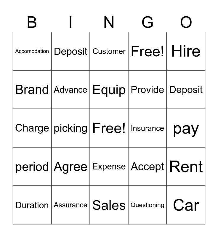 This bingo card has a free space and 24 words: Agree, Assurance, Equip, Duration, Hire, Accomodation, Brand, Deposit, Insurance, Expense, Provide, Charge, Accept, Rent, Advance, Questioning, pay, Customer, Deposit, picking, Car, period, Free! and Sales.