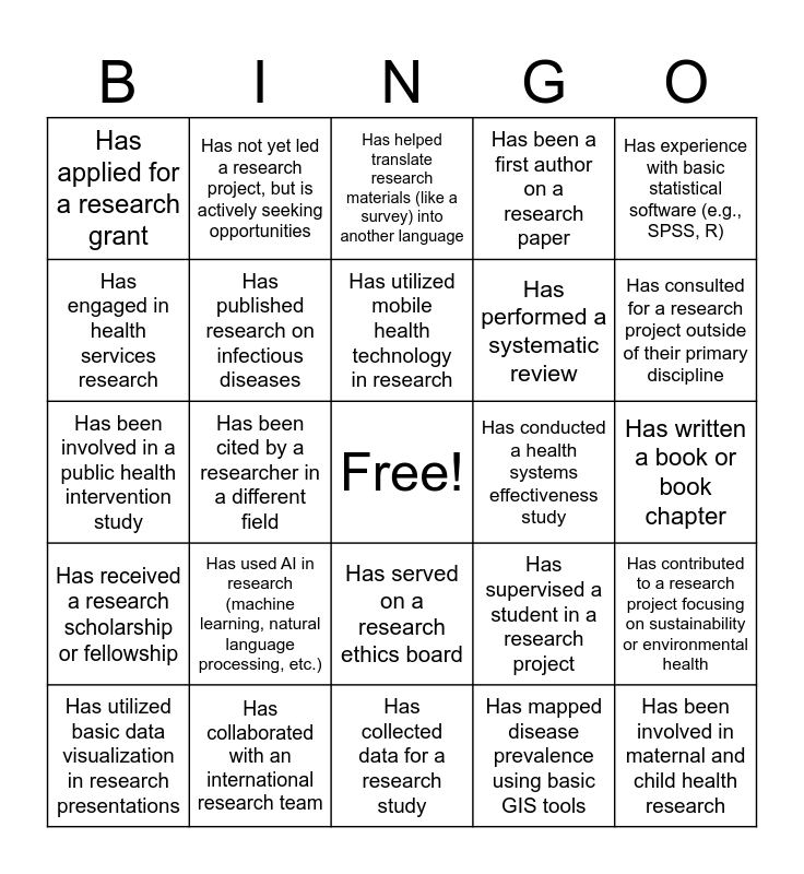 This bingo card has a free space and 62 words: Has created a research poster for a scientific meeting, Has collaborated with an international research team, Has conducted an epidemiological survey, Has received a research scholarship or fellowship, Has been part of a longitudinal cohort study, Has published a case report or case series, Has published research on infectious diseases, Has had their research rejected by others at some stage, Has performed a systematic review, Has written a research proposal, Has been a first author on a research paper, Has revised a research paper more than twice, Has engaged in health services research, Has had research impact local healthcare policy, Has conducted research in a language other than English (e.g., Swahili), Has applied for a research grant, Has been involved in maternal and child health research, Has experience with basic statistical software (e.g., SPSS, R), Has contributed to community health education, Has utilized mobile health technology in research, Has conducted a health systems effectiveness study, Has helped translate research materials (like a survey) into another language, Has utilized basic data visualization in research presentations, Has mapped disease prevalence using basic GIS tools, Has had to adapt research methods due to resource limitations, Has recorded a podcast episode or webinar to disseminate research findings, Has investigated local dietary practices and their health impacts, Has been part of a research study that spanned multiple countries, Has contributed to a research project focusing on sustainability or environmental health, Has experienced challenges with participant recruitment in a study, Has been a peer reviewer for a journal, Has been part of a research project that received media attention, Has initiated a pilot program to improve local healthcare delivery, Has contributed to a public health guideline, Has written a book or book chapter, Has not yet led a research project, but is actively seeking opportunities, Has taken a course or workshop to improve research skills in the past year, Has used basic laboratory techniques in research (e.g., microscopy, blood smears), Has been cited by a researcher in a different field, Has conducted a randomized controlled trial, Has been involved in a public health intervention study, Has received funding for a research study, Has used AI in research (machine learning, natural language processing, etc.), Has been part of a regional research consortium, Has consulted for a research project outside of their primary discipline, Has supervised a student in a research project, Has not yet published a research paper, but is inspired to try, Has mentored a junior researcher, Has published research on cancer, Has attended a research workshop or training, Has served on a research ethics board, Has collected data for a research study, Has conducted a literature review, Has presented at a national conference, Has conducted peer review for a regional journal, Has not yet independently analyzed research data, but has practiced with sample datasets, Has trained others in research methodologies, Has published a research article with more than five co-authors, Has submitted an application to an ethics review board, Has not yet presented at a conference, but is preparing to submit an abstract, Has conducted a health-related qualitative interview or focus group and Has conducted or contributed to a meta-analysis.