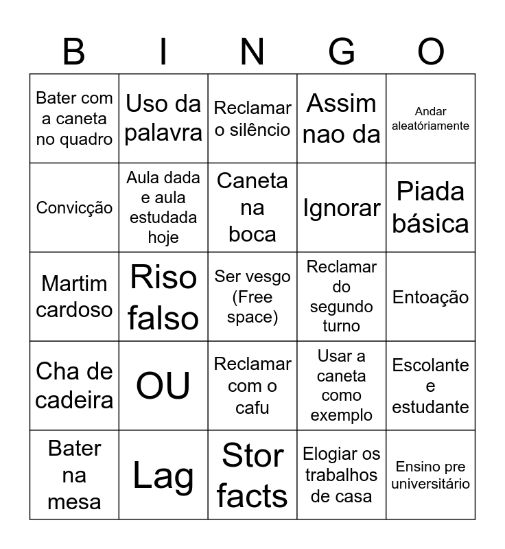 This bingo card has a free space and 24 words: OU, Lag, Caneta na boca, Bater na mesa, Andar aleatóriamente, Bater com a caneta no quadro, Convicção, Uso da palavra, Reclamar do segundo turno, Reclamar com o cafu, Ignorar, Martim cardoso, Usar a caneta como exemplo, Escolante e estudante, Aula dada e aula estudada hoje, Elogiar os trabalhos de casa, Entoação, Reclamar o silêncio, Piada básica, Riso falso, Ensino pre universitário, Cha de cadeira, Assim nao da and Stor facts.