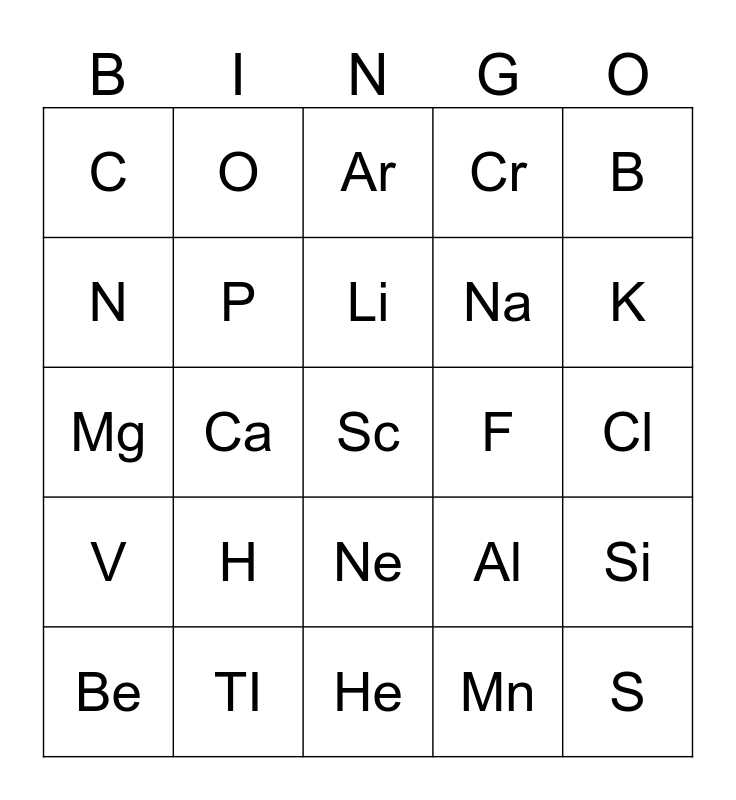This bingo card has 25 words: H, He, Li, Be, B, C, N, O, F, Ne, Na, Mg, Al, Si, P, S, Cl, Ar, K, Ca, Sc, TI, V, Cr and Mn.