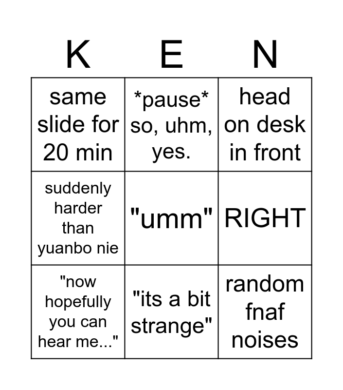 This bingo card has a free space and 8 words: RIGHT, head on desk in front, *pause* so, uhm, yes., "now hopefully you can hear me...", same slide for 20 min, random fnaf noises, suddenly harder than yuanbo nie and "its a bit strange".