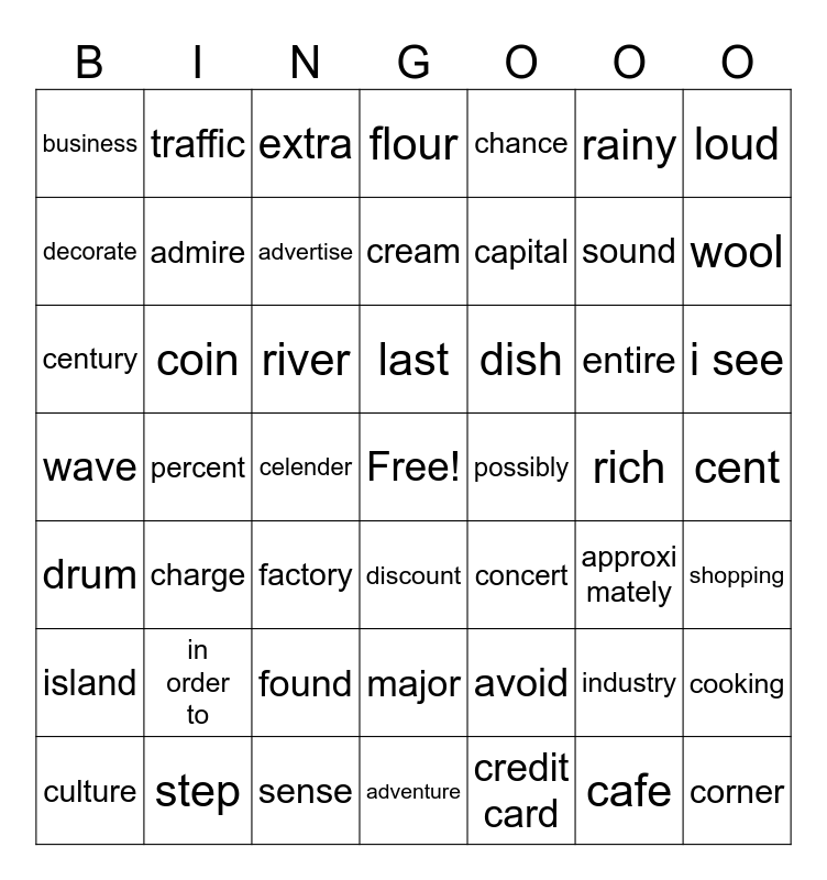 This bingo card has a free space and 48 words: avoid, sound, adventure, percent, river, cent, traffic, step, rainy, discount, loud, flour, entire, dish, island, rich, decorate, wool, industry, chance, capital, celender, business, admire, cooking, advertise, i see, culture, last, coin, cafe, possibly, shopping, in order to, wave, concert, approxi mately, century, factory, found, drum, corner, extra, sense, cream, major, charge and credit card.