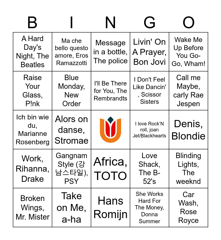 This bingo card has a free space and 60 words: Working in the Coal, Mine Lee Dorsey, Take on Me, a-ha, 9 to 5, Dolly Parton, Work, Rihanna, Drake, She Works Hard For The Money, Donna Summer, We Can Work It Out , The Beatles, Blue Monday, New Order, Oya Lélé, K3, I Don't Feel Like Dancin' , Scissor Sisters, Sexy Als Ik, DansNielson, Livin' On A Prayer, Bon Jovi, Dansen Op De Vulkaan, De Dijk, Raise Your Glass, P!nk, Clocks, Coldplay, Noodgeval, Goldband, A Hard Day's Night, The Beatles, Car Wash, Rose Royce, Wake Me Up Before You Go-Go, Wham!, I Gotta Feeling, Black Eyed Peas, I'll Be There for You, The Rembrandts, I love Rock’N roll, joan Jet/Blackhearts, Message in a bottle, The police, Broken Wings, Mr. Mister, Blinding Lights, The weeknd, Single Ladies, Beyoncé, YMCA, Village People, Broodje Bakpao, Opposites/sef/Pardoel, Kids, MGMT, Call me Maybe, carly Rae Jespen, Born Slippy (Nuxx), Underworld, I Kissed A Girl, Katy Perry, All That She Wants, Ace of base, Iedereen is van de wereld, The Scene, Love Really Hurts Without You, Billy Ocean, Ma che bello questo amore, Eros Ramazzotti, Never Gonna Give You Up, Rick Astley, One More Time, Daft Punk, Alors on danse, Stromae, Links Rechts, Snollebollekes, Ich bin wie du, Marianne Rosenberg, Paloma Blanca, George Baker, Gangnam Style (강남스타일), PSY, Denis, Blondie, Moves Like Jagger, Maroon 5/Christina Aguilera, Love Shack, The B-52's, Dans Je De Hele Nacht Met Mij, De Sjonnies, Ashes to Ashes, David Bowie, Walking On Sunshine, Katrina & The Waves, I'm So Excited, The Pointer Sisters, Africa, TOTO, Hans Romijn, Hans van Goudoever, Texel, Vlieland, De Waag, Herman Finkers, Jochem Myjer, Waar, Niet waar and Serendib.