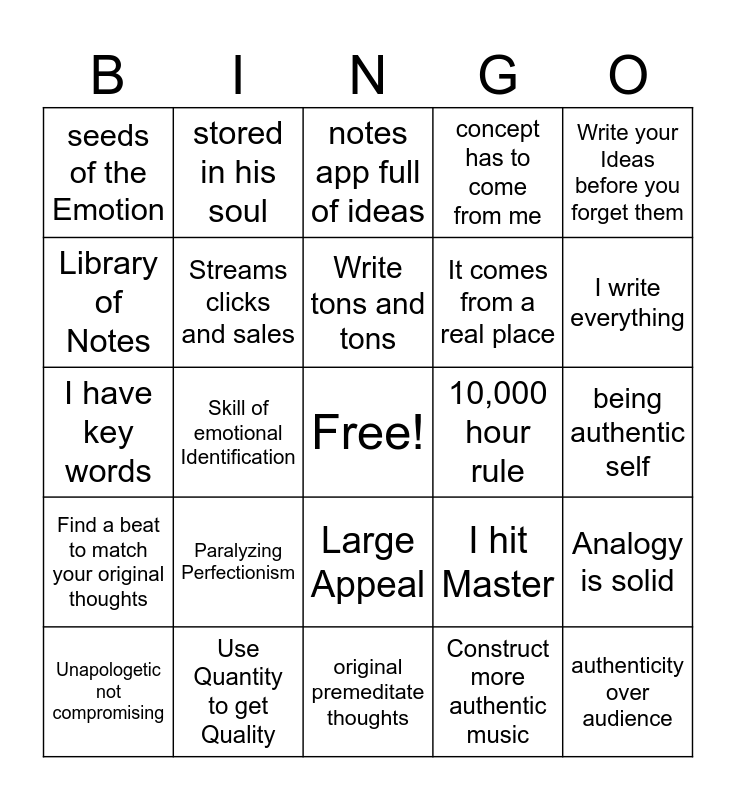 This bingo card has a free space and 24 words: Paralyzing Perfectionism, Use Quantity to get Quality, Write tons and tons, Unapologetic not compromising, Write your Ideas before you forget them, seeds of the Emotion, Library of Notes, stored in his soul, 10,000 hour rule, Large Appeal, It comes from a real place, I have key words, I hit Master, Analogy is solid, Streams clicks and sales, Construct more authentic music, being authentic self, notes app full of ideas, I write everything, Skill of emotional Identification, authenticity over audience, Find a beat to match your original thoughts, concept has to come from me and original premeditate thoughts.