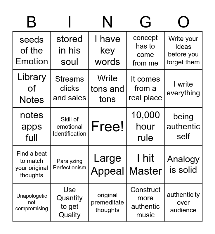 This bingo card has a free space and 24 words: Paralyzing Perfectionism, Use Quantity to get Quality, Write tons and tons, Unapologetic not compromising, Write your Ideas before you forget them, seeds of the Emotion, Library of Notes, stored in his soul, 10,000 hour rule, Large Appeal, It comes from a real place, notes apps full, I hit Master, Analogy is solid, Streams clicks and sales, Construct more authentic music, being authentic self, I have key words, I write everything, Skill of emotional Identification, authenticity over audience, Find a beat to match your original thoughts, concept has to come from me and original premeditate thoughts.