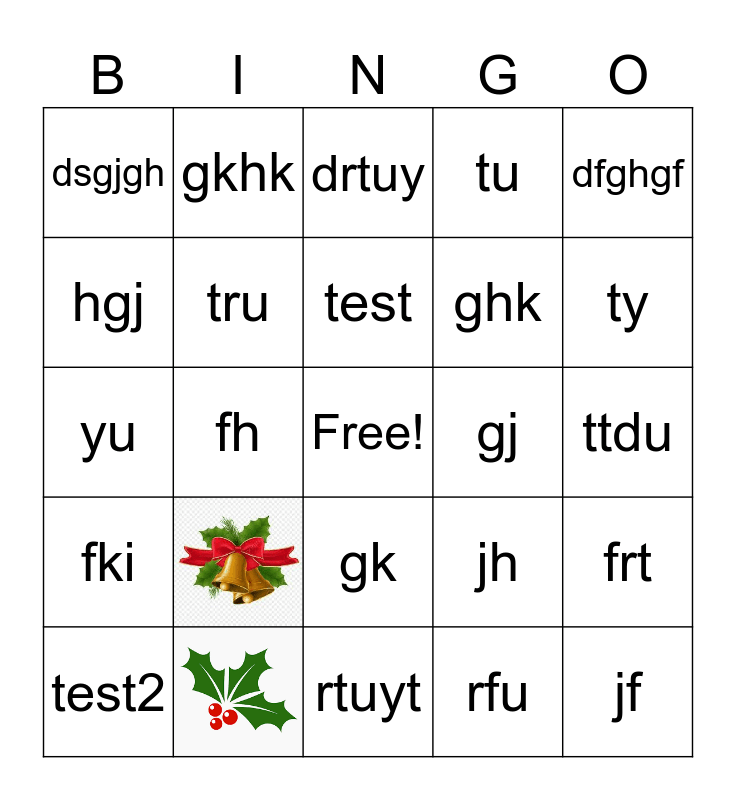 This bingo card has 2 images, a free space and 22 words: test, test2, dfghgf, dsgjgh, hgj, gkhk, gj, gk, ghk, yu, jh, frt, tru, rfu, ttdu, drtuy, ty, fh, jf, fki, tu and rtuyt.