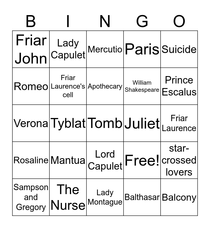 This bingo card has 25 words: Mantua, Lady Montague, Apothecary, Sampson and Gregory, Suicide, Friar John, Romeo, Lady Capulet, Juliet, Lord Capulet, William Shakespeare, Verona, Free!, star-crossed lovers, Friar Laurence's cell, Balcony, Friar Laurence, Mercutio, Prince Escalus, Tyblat, Tomb, The Nurse, Rosaline, Paris and Balthasar.