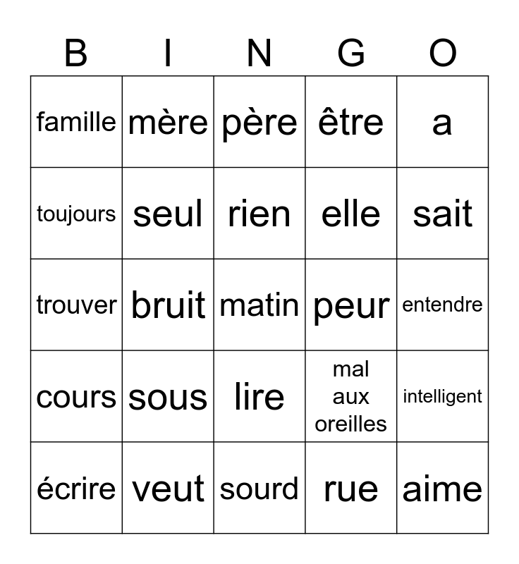 This bingo card has 31 words: sourd, ville, bruit, lumière, famille, père, seul, mal aux oreilles, peur, rue, entendre, matin, aime, autre, sait, est, intelligent, sous, cours, lire, a, il, écrire, mère, elle, toujours, être, trouver, veut, rien and pas.