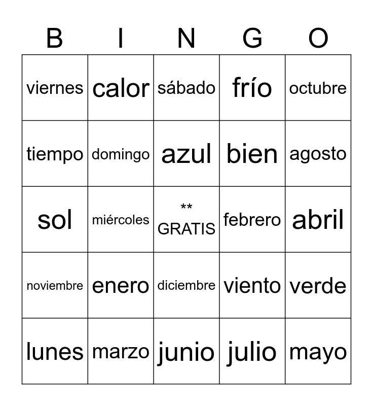 This bingo card has a free space and 29 words: lunes, martes, miércoles, jueves, viernes, sábado, domingo, enero, febrero, marzo, abril, mayo, junio, julio, agosto, septiembre, diciembre, noviembre, octubre, sol, viento, mal, bien, tiempo, frío, calor, verde, azul and rojo.
