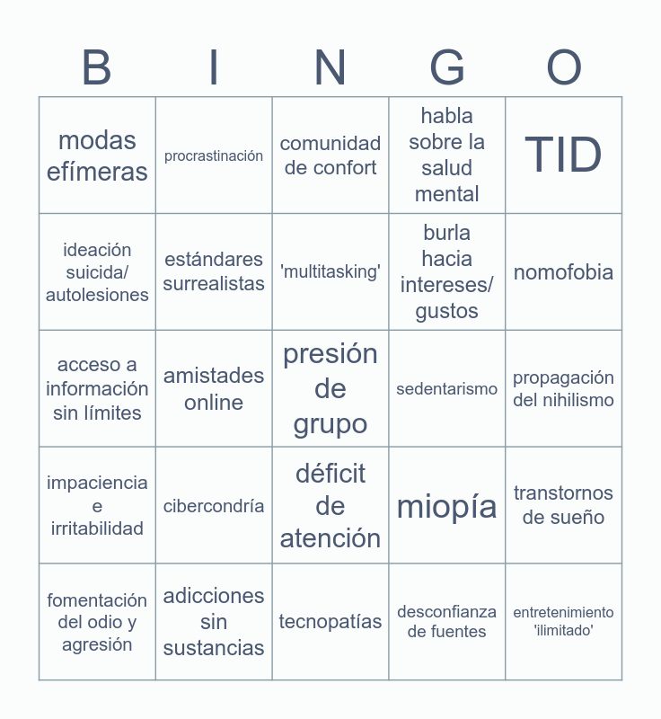 This bingo card has 28 words: transtornos de sueño, e-ludopatía, burla hacia intereses/ gustos, desconfianza de fuentes, ideación suicida/ autolesiones, comunidad de confort, procrastinación, impaciencia e irritabilidad, sedentarismo, fomentación del odio y agresión, acceso a información sin límites, habla sobre la salud mental, adicciones sin sustancias, tecnopatías, nomofobia, e-ludopatía, cibercondría, estándares surrealistas, 'multitasking', déficit de atención, modas efímeras, entretenimiento 'ilimitado', presión de grupo, amistades online, propagación del nihilismo, miopía, TID and robo de identidad.