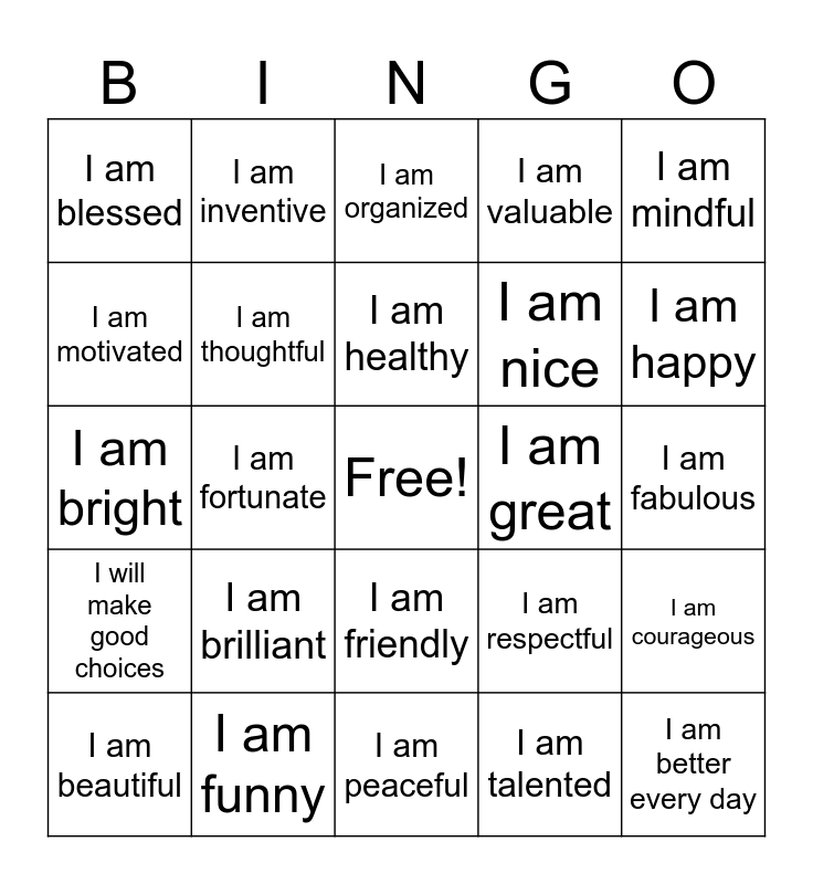 This bingo card has a free space and 60 words: I am positive, I am funny, I have limitless potential, I will make good choices, I am talented, I show empathy, I am thoughtful, I am caring, I am nice, I am helpful, I am valuable, I respect myself, I am motivated, I will succeed, I am capable, I am blessed, I am better every day, I am mindful, I am wise, I am healthy, I am great, I am organized, I am beautiful, I am courageous, I have positive and healthy relationship, I am creative, I am productive, I do my best every day, I am happy, I am free of worry or regret, I am thankful for all that I have, I feel great about my body, I am amazing, I am extraordinary, I am inventive, I am generous, I am passionate, I am fortunate, I am unique, I am bright, I am trustworthy, I am brilliant, I am fabulous, I am compassionate, I am respectful, I am willing, I am intelligent, I am patient, I am deserving, I am friendly, I am peaceful, I am loved, I help others, I ask for help, I am good enough, My life is important, I am worthy, I try my best, I am brave and My existence matters.
