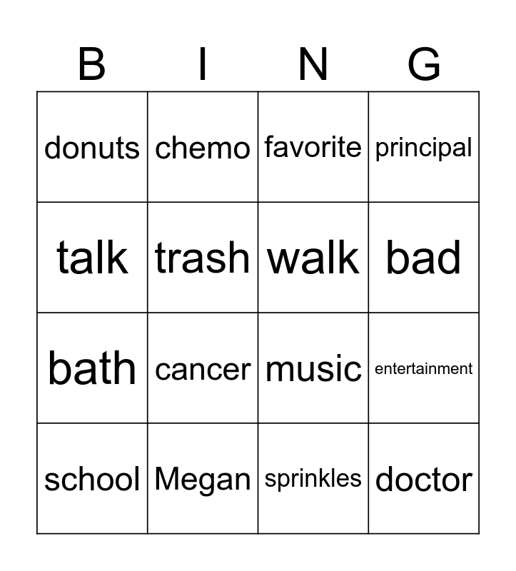 This bingo card has 30 words: Hi, your, entertainment, Katie, donuts, favorite, walk, lobby, Megan, rainbow, sprinkles, school, high, best, cancer, hair, clear, doctor, mom, talk, music, dress, chemo, bath, trash, principal, friends, stupid, bad and upset.