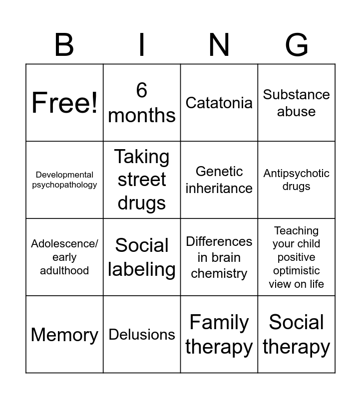This bingo card has 16 words: Memory, Delusions, Catatonia, Substance abuse, Developmental psychopathology, 6 months, Differences in brain chemistry, Teaching your child positive optimistic view on life, Free!, Taking street drugs, Family therapy, Antipsychotic drugs, Adolescence/ early adulthood, Social labeling, Genetic inheritance and Social therapy.