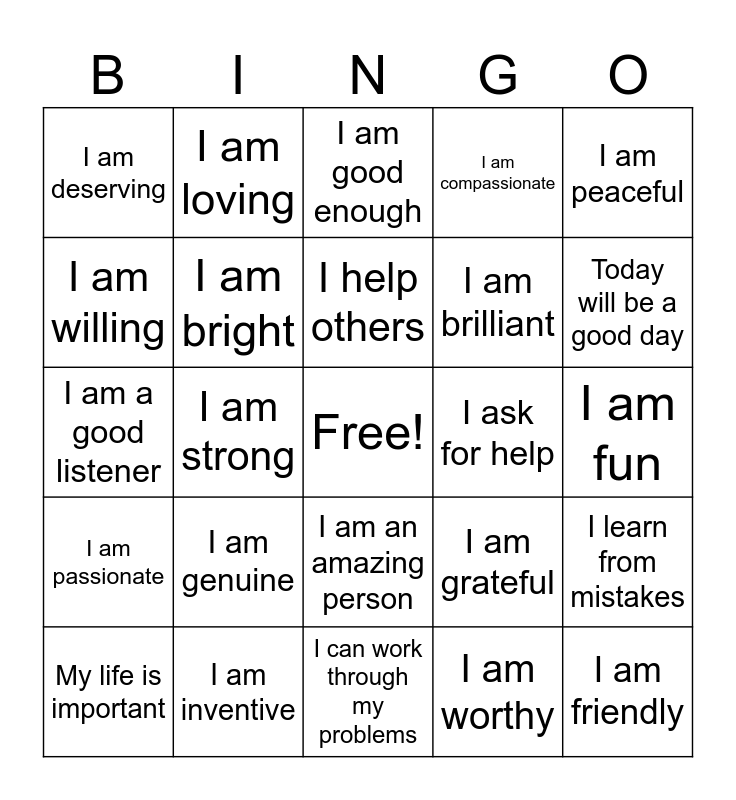 This bingo card has a free space and 62 words: I am extraordinary, I am inventive, I am generous, I am passionate, I am fortunate, I am unique, I am bright, I am trustworthy, I am brilliant, I am fabulous, I am compassionate, I am respectful, I am willing, I am intelligent, I am patient, I am deserving, I am friendly, I am peaceful, I am loved, I help others, I ask for help, I am good enough, My life is important, I am worthy, I try my best, I am brave, My existence matters, My life has meaning, I learn from mistakes, I am awesome, I am growing, I am not a failure, I refuse to quit, I am forgiving, I am fun, I am loving, I am honest, I am a leader, I am strong, I am supportive, I am a good listener, I am a hard worker, I am genuine, I am enough, Today will be a good day, I am grateful, I am confident, I am powerful, I am proud of myself, I get better every day, I am an amazing person, I can work through my problems, It's OK to make mistakes, I deserve to be happy, I can make a difference, I matter, Good things are going to come to me, Today, I will work through my challenges, I have everything I need right now, Everything will be OK, I believe in myself and I can do hard things.