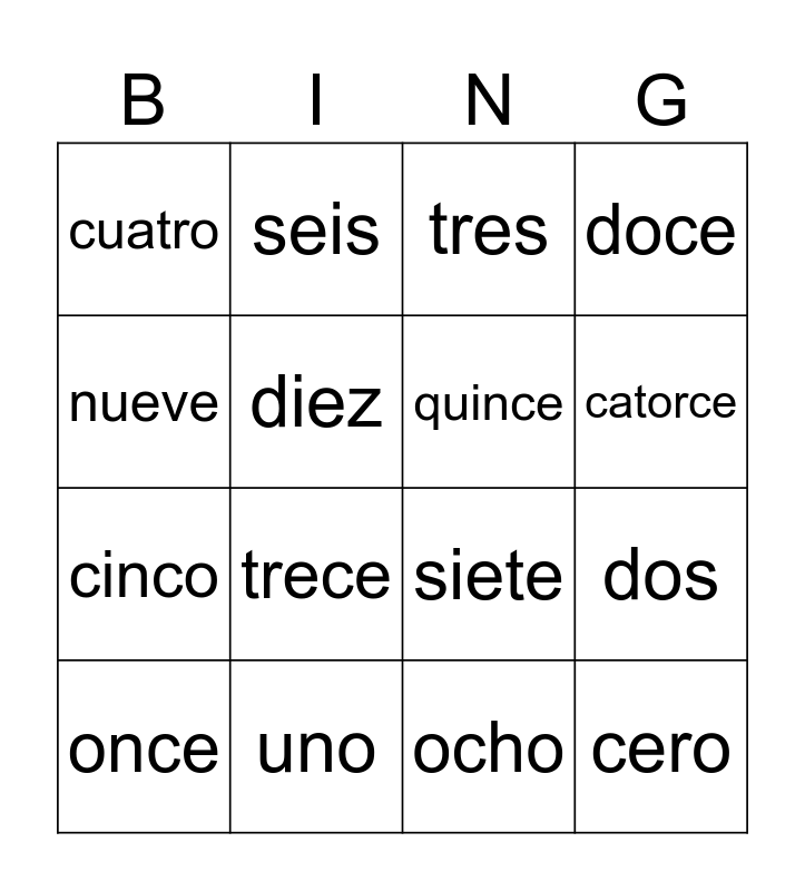This bingo card has 16 words: uno, dos, tres, cuatro, cinco, seis, siete, ocho, nueve, diez, once, doce, trece, catorce, quince and cero.