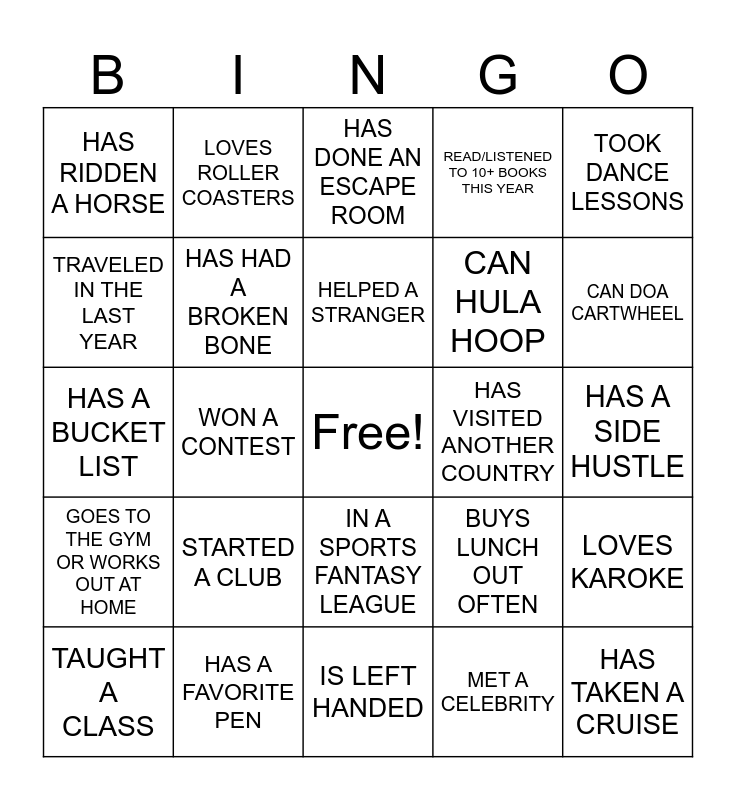 This bingo card has a free space and 24 words: STARTED A CLUB, HAS A FAVORITE PEN, HELPED A STRANGER, TAUGHT A CLASS, TOOK DANCE LESSONS, HAS RIDDEN A HORSE, TRAVELED IN THE LAST YEAR, LOVES ROLLER COASTERS, HAS VISITED ANOTHER COUNTRY, IN A SPORTS FANTASY LEAGUE, CAN HULA HOOP, HAS A BUCKET LIST, BUYS LUNCH OUT OFTEN, LOVES KAROKE, HAS HAD A BROKEN BONE, MET A CELEBRITY, HAS A SIDE HUSTLE, HAS DONE AN ESCAPE ROOM, CAN DOA CARTWHEEL, WON A CONTEST, HAS TAKEN A CRUISE, GOES TO THE GYM OR WORKS OUT AT HOME, READ/LISTENED TO 10+ BOOKS THIS YEAR and IS LEFT HANDED.