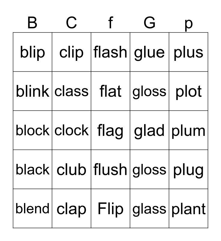 This bingo card has 25 words: black, clap, flag, glass, plus, blip, clip, flash, glad, plug, blink, class, Flip, gloss, plot, blend, clock, flat, gloss, plum, block, club, flush, glue and plant.
