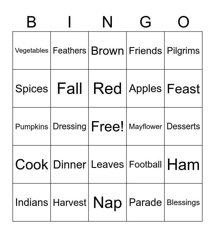 This bingo card has a free space and 33 words: Turkey, Pie, Dressing, Eat, Cook, Fall, Pilgrims, Indians, Feathers, Yellow, Red, Brown, Family, Grateful, Mayflower, Feast, Harvest, Pumpkins, Dinner, Football, Leaves, Potatoes, Vegetables, Desserts, Nap, Blessings, Friends, Apples, Spices, Ham, Celebration, Parade and Holiday.