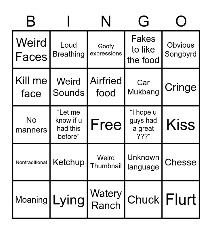 This bingo card has a free space and 31 words: Watery Ranch, Fries, “Let me know if u had this before”, Unappetizing food, Weird Faces, Goofy expressions, Weird Sounds, Unknown language, “I hope u guys had a great ???”, Chuck, Kiss, Flurt, Talking about the weather, Burgers, Cringe, Her cooking, Chesse, Ketchup, Nontraditional, Weird Thumbnail, Obvious Songbyrd, Sleepy Chuck, Moaning, Loud Breathing, Car Mukbang, Kill me face, Fakes to like the food, No manners, Lying, Airfried food and “Do you like ???”.
