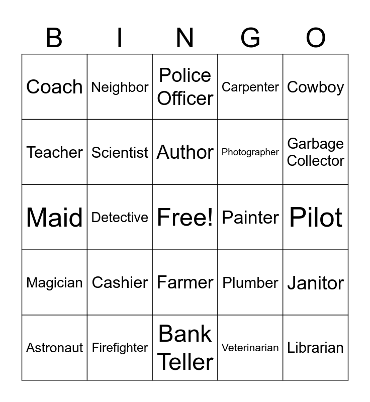 This bingo card has a free space and 24 words: Cashier, Firefighter, Author, Astronaut, Cowboy, Coach, Teacher, Neighbor, Painter, Farmer, Photographer, Maid, Plumber, Janitor, Scientist, Veterinarian, Pilot, Police Officer, Garbage Collector, Detective, Librarian, Magician, Carpenter and Bank Teller.