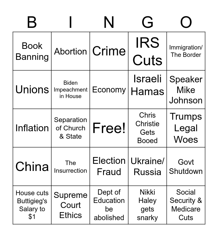 This bingo card has a free space and 24 words: The Insurrection, Supreme Court Ethics, Economy, House cuts Buttigieg's Salary to $1, Immigration/ The Border, Book Banning, Unions, Abortion, Chris Christie Gets Booed, Election Fraud, Israeli Hamas, Inflation, Ukraine/ Russia, Govt Shutdown, Biden Impeachment in House, Nikki Haley gets snarky, Trumps Legal Woes, Crime, Speaker Mike Johnson, Separation of Church & State, Social Security & Medicare Cuts, China, IRS Cuts and Dept of Education be abolished.