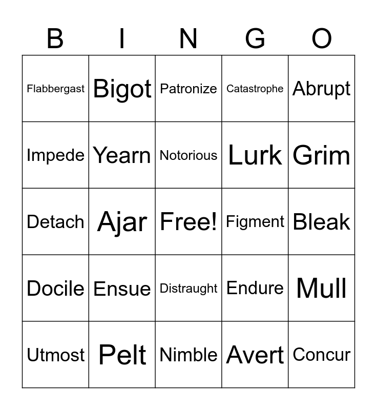 This bingo card has a free space and 24 words: Ensue, Pelt, Notorious, Utmost, Abrupt, Flabbergast, Impede, Bigot, Figment, Distraught, Lurk, Detach, Endure, Mull, Yearn, Avert, Bleak, Patronize, Grim, Ajar, Concur, Docile, Catastrophe and Nimble.