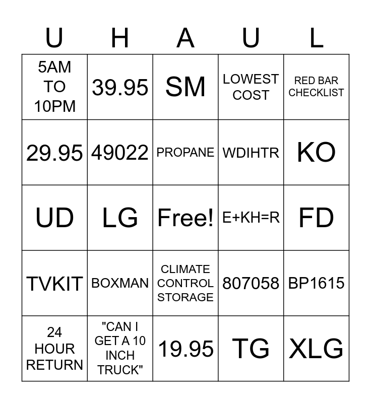 This bingo card has a free space and 24 words: BOXMAN, "CAN I GET A 10 INCH TRUCK", PROPANE, 24 HOUR RETURN, RED BAR CHECKLIST, 5AM TO 10PM, 29.95, 39.95, E+KH=R, CLIMATE CONTROL STORAGE, WDIHTR, UD, 807058, BP1615, 49022, TG, FD, SM, KO, LG, XLG, TVKIT, LOWEST COST and 19.95.