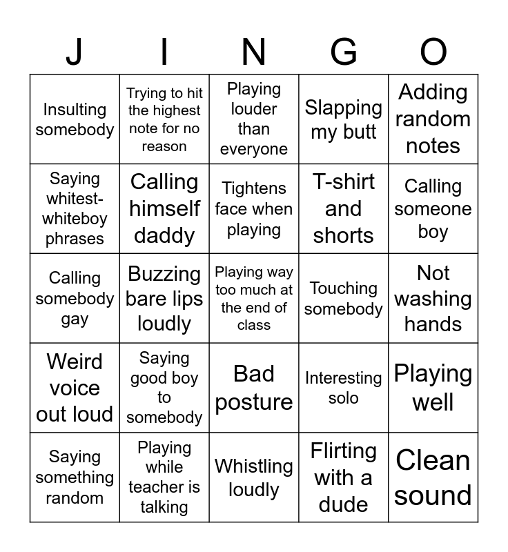 This bingo card has 36 words: Playing way after stopping, Playing undesirably loud, Mess up counting, Calling himself daddy, Interesting solo, Weird voice out loud, Tightens face when playing, Buzz mouthpiece for no apparent reason, Adding random notes, Falling when it adds nothing, Buzzing bare lips loudly, Slapping my butt, Not very open sound (Free), Touching somebody, Calling someone boy, Insulting somebody, Clean sound, Saying good boy to somebody, Playing way too much at the end of class, Playing louder than everyone, Not washing hands, Playing well, Playing while teacher is talking, Saying something random, Whistling loudly, Trying to hit the highest note for no reason, Calling somebody gay, Playing at the ceiling, T-shirt and shorts, Saying whitest-whiteboy phrases, Saying some random meme, Saying bro, Flirting with a dude, Bad posture, Ending a solo with a fall and Ending a solo with a high note.