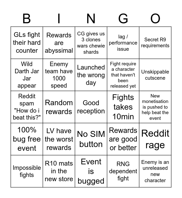 This bingo card has 25 words: LV have the worst rewards, Event is bugged, Launched the wrong day, Impossible fights, Secret R9 requirements, GLs fight their hard counter, Wild Darth Jar Jar appear, Rewards are abyssimal, Fights takes 10min, No SIM button, Fight require a character that haven't been released yet, Reddit spam "How do i beat this?", Rewards are good or better, Reddit rage, Enemy team have 1000 speed, Enemy is an unreleased new character, New monetisation is pushed to help beat the event, CG gives us 3 clones wars chewie shards, Unskippable cutscene, Random rewards, Good reception, R10 mats in the new store, 100% bug free event, lag / performance issue and RNG dependent fight.