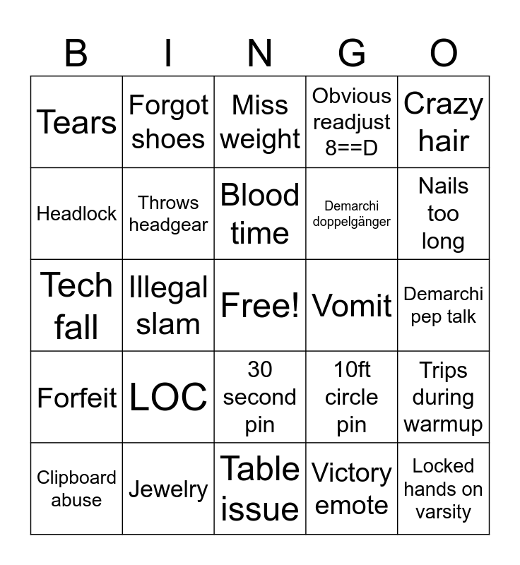 This bingo card has a free space and 24 words: LOC, Jewelry, Blood time, Clipboard abuse, Crazy hair, Tears, Headlock, Forgot shoes, Vomit, 30 second pin, Demarchi doppelgänger, Tech fall, 10ft circle pin, Trips during warmup, Throws headgear, Victory emote, Demarchi pep talk, Miss weight, Nails too long, Illegal slam, Locked hands on varsity, Forfeit, Obvious readjust 8==D and Table issue.