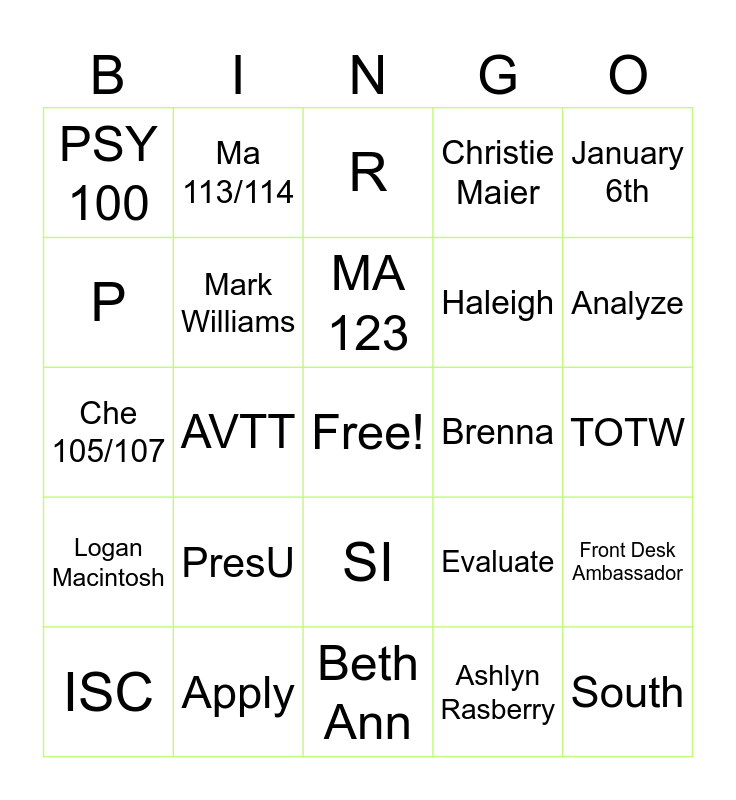 This bingo card has a free space and 74 words: Apply, G, R, O, U, P, Deep, Jacob, Brenna, Haleigh, Kalen, Aliyah, Beth Ann, Christie Maier, Rachael Deel, ISC, PresU, SI, January 5th, January 6th, Che 105/107, Ma 113/114, MA 123, Evaluate, Analyze, Understand, G, R, O, U, P, Create, Remember, North, South, Central, North, South, Central, Thursdays at 5, Thursdays at 5, AVTT, NTT, VTT, November 21-26th, PSY 100, Apply, Evaluate, Understand, Create, Remember, Analyze, November 11th, CHSG, Kiara Rizzuti, Busari Isiaka, Mark Williams, SPC, Supervisor on Shift, Front Desk Ambassador, Logan Macintosh, Jennifer Malone, Cat Bridegam, Ashlyn Rasberry, TOTW, Brenna, Kalen, Aliyah, Haleigh, Deep, Jacob, Beth Ann, 4-8 and 2-10.