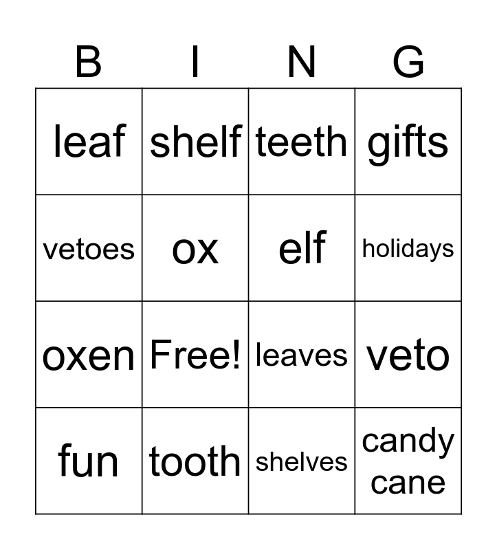 This bingo card has 16 words: tooth, veto, teeth, leaf, oxen, shelf, leaves, shelves, vetoes, ox, fun, gifts, Free!, holidays, elf and candy cane.