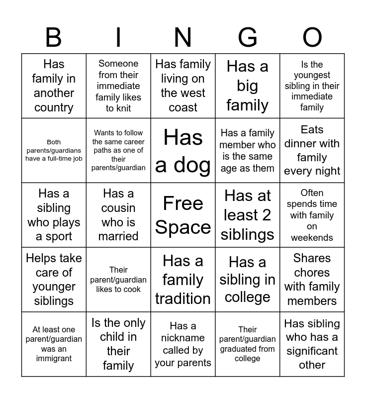 This bingo card has a free space and 24 words: Their parent/guardian likes to cook, Is the only child in their family, Has a dog, At least one parent/guardian was an immigrant, Is the youngest sibling in their immediate family, Has family in another country, Both parents/guardians have a full-time job, Someone from their immediate family likes to knit, Has at least 2 siblings, Has a family tradition, Has a family member who is the same age as them, Has a sibling who plays a sport, Has a sibling in college, Shares chores with family members, Wants to follow the same career paths as one of their parents/guardian, Their parent/guardian graduated from college, Often spends time with family on weekends, Has family living on the west coast, Eats dinner with family every night, Has a cousin who is married, Has sibling who has a significant other, Helps take care of younger siblings, Has a big family and Has a nickname called by your parents.