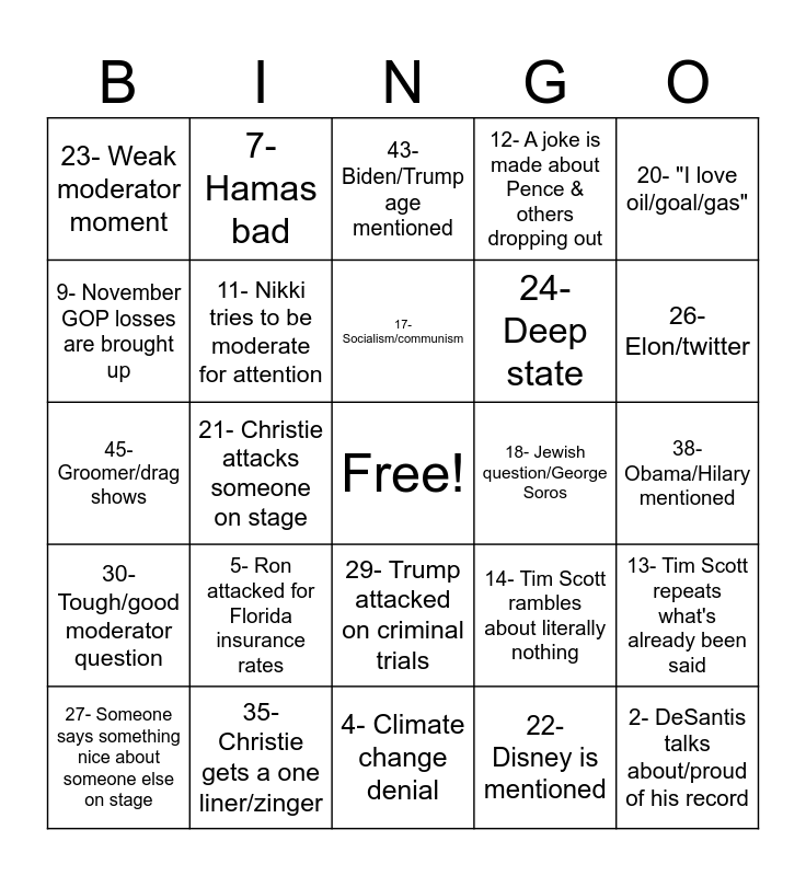This bingo card has a free space and 48 words: 1- Woke, 2- DeSantis talks about/proud of his record, 3- "Here in Florida", 4- Climate change denial, 5- Ron attacked for Florida insurance rates, 6- 2020 Denial, 7- Hamas bad, 8- Vivek says something crazy about foreign policy, 9- November GOP losses are brought up, 10- Vivek refuses to attack trump, 11- Nikki tries to be moderate for attention, 12- A joke is made about Pence & others dropping out, 13- Tim Scott repeats what's already been said, 14- Tim Scott rambles about literally nothing, 15- Audience boo's, 16- Minority group attacked, 17- Socialism/communism, 18- Jewish question/George Soros, 19- States' rights, 20- "I love oil/goal/gas", 21- Christie attacks someone on stage, 22- Disney is mentioned, 23- Weak moderator moment, 24- Deep state, 25- Cancel/censorship, 26- Elon/twitter, 27- Someone says something nice about someone else on stage, 28- Slavery was good, 29- Trump attacked on criminal trials, 30- Tough/good moderator question, 31- "We must support the nominee", 32- Someone defends palestinians, 33- Someone defends Israel, 34- School choice, 35- Christie gets a one liner/zinger, 36- Vivek vs Nikki drama/fight, 37- Hunter biden/laptop, 38- Obama/Hilary mentioned, 39- Someone refuses to be clear on abortion, 40- Someone refuses to be clear on cannabis, 41- "Raise voting age", 42- Border, 43- Biden/Trump age mentioned, 44- California/NY/blue cities bad, 45- Groomer/drag shows, 46- Someone wants to fire federal employees, 47- Unions bad and 48- "Traditional values/nuclear family".