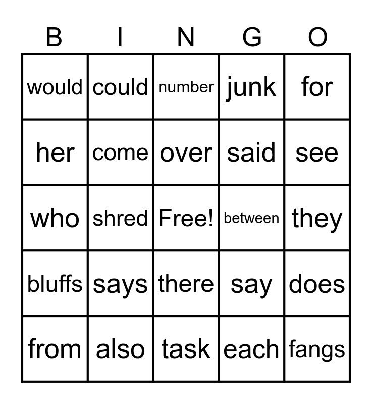 This bingo card has a free space and 24 words: says, also, over, from, for, would, her, could, between, there, said, who, say, does, come, each, they, number, see, shred, fangs, bluffs, junk and task.