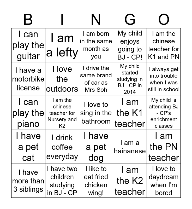 This bingo card has a free space and 24 words: I drink coffee everyday, I have two children studying in BJ - CP, I drive the same brand of car as Mrs Soh, I have more than 3 siblings, I am the chinese teacher for K1 and PN, I can play the guitar, I have a motorbike license, I am a lefty, I am the K1 teacher, I have a pet dog, My child started studying in BJ - CP in 2014, I can play the piano, I am a hainanese, I am the PN teacher, I love the outdoors, I am the K2 teacher, My child is attending BJ - CP's enrichment classes, I am born in the same month as you, I always get into trouble when I was still in school, I am the chinese teacher for Nursery and K2, I love to daydream when I'm bored, I have a pet cat, My child enjoys going to BJ - CP! and I like to eat fried chicken wing!.