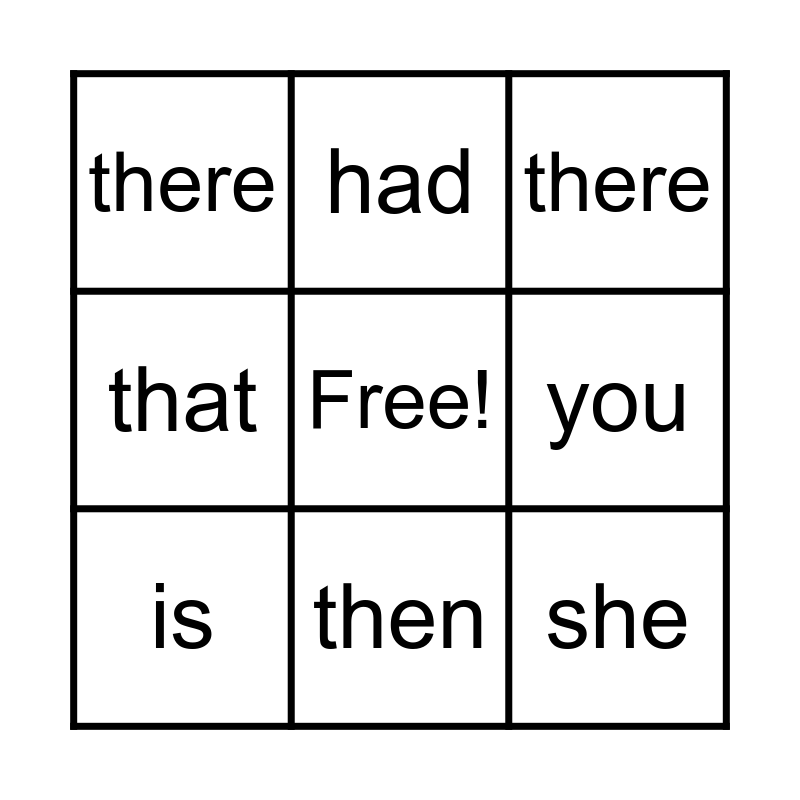 This bingo card has a free space and 11 words: so, then, she, is, had, there, you, that, that, there and then.