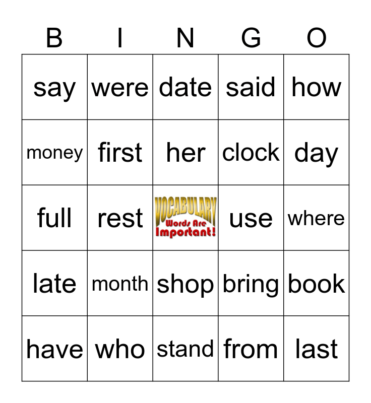 This bingo card has a free space and 24 words: month, who, her, have, how, say, money, were, use, shop, clock, full, bring, book, first, from, where, date, day, rest, last, late, said and stand.