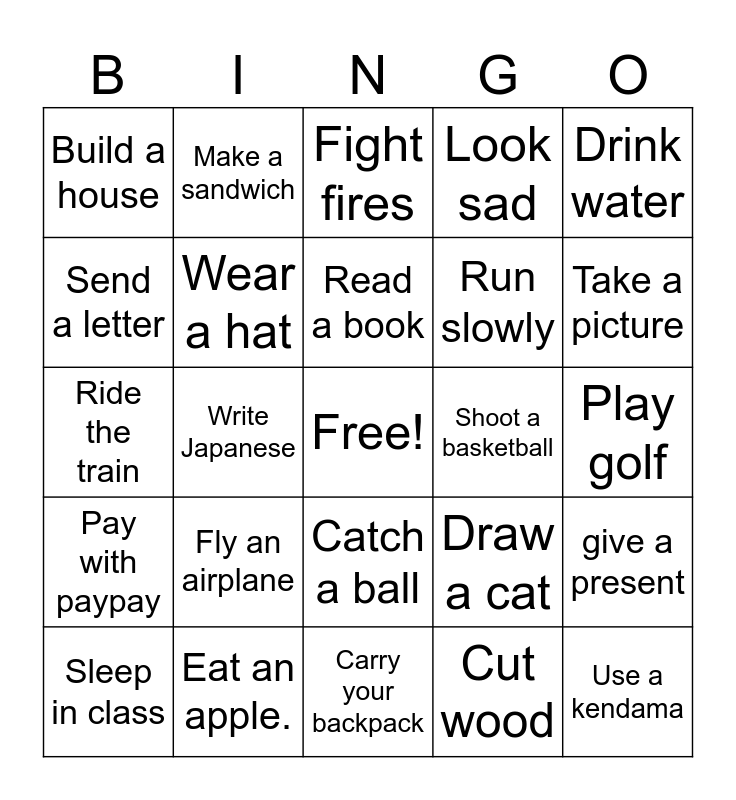 This bingo card has a free space and 24 words: Fly an airplane, Eat an apple., Read a book, Sleep in class, Drink water, Build a house, Send a letter, Make a sandwich, Shoot a basketball, Catch a ball, Run slowly, Ride the train, Draw a cat, give a present, Wear a hat, Cut wood, Play golf, Fight fires, Take a picture, Write Japanese, Use a kendama, Pay with paypay, Look sad and Carry your backpack.