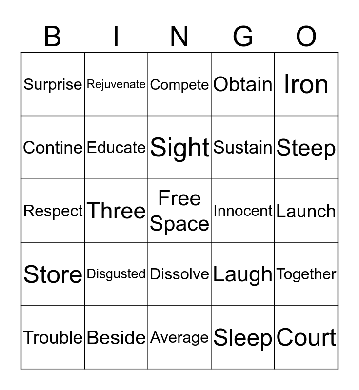 This bingo card has a free space and 32 words: Sleep, Require, Three, Desire, Store, Educate, Iron, Together, Rejuvenate, Disgusted, Sight, Compete, Through, Panic, Innocent, Research, Trouble, Respect, Dissolve, Disgusted, Laugh, Language, Launch, Beside, Court, Obtain, Sustain, Contine, Surprise, Average, Ridge and Steep.