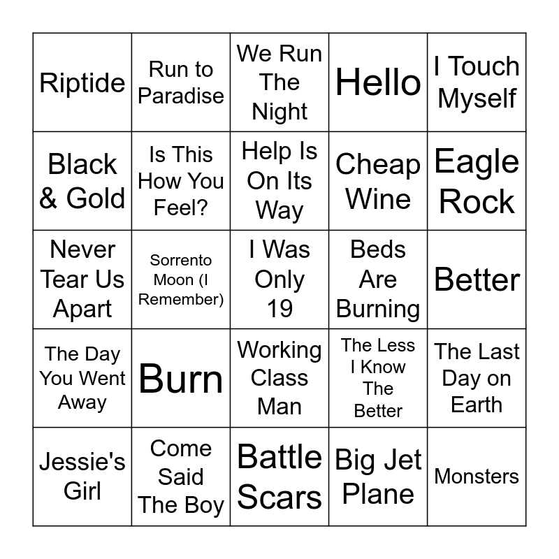This bingo card has 50 words: Chandelier, I Was Only 19, My People, Battle Scars, Burn, Down Under, Run to Paradise, Black Fingernails, Red Wine, Black & Gold, What's My Scene, Is This How You Feel?, Hello, The Last Day on Earth, The Less I Know The Better, Holy Grail, What About Me?, Help Is On Its Way, Beds Are Burning, Somewhere Down The Barrel, I Touch Myself, Sorrento Moon (I Remember), Big Jet Plane, Riptide, Cheap Wine, Friday on My Mind, Monsters, Eagle Rock, Can't Get You out of My Head, We Run The Night, Working Class Man, Sounds of Then (This Is Australia), Are You Gonna Be My Girl, Torn, Stayin' Alive, Come Said The Boy, Evie (Part One), Never Let Me Go, Every Time You Cry, It's a Long Way to the Top (If You Wanna Rock 'N' Roll), Better, Howzat, I Am Woman, Love Is In The Air, Lost Without You, Jessie's Girl, Never Tear Us Apart, She's Like A Comet, Red Right Hand, The Day You Went Away and Prisoner of Society.