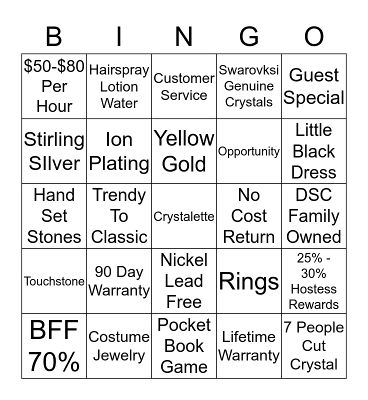 This bingo card has 25 words: 90 Day Warranty, Pocket Book Game, Yellow Gold, BFF 70%, Guest Special, $50-$80 Per Hour, Stirling SIlver, Hairspray Lotion Water, No Cost Return, Nickel Lead Free, Opportunity, Hand Set Stones, Rings, 25% - 30% Hostess Rewards, Ion Plating, 7 People Cut Crystal, DSC Family Owned, Customer Service, Little Black Dress, Trendy To Classic, Crystalette, Costume Jewelry, Touchstone, Swarovksi Genuine Crystals and Lifetime Warranty.