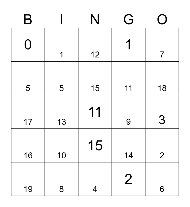 This bingo card has a free space and 24 words: 10, 8, 15, 19, 7, 0, 5, 1, 9, 15, 11, 17, 14, 2, 5, 2, 3, 12, 18, 13, 6, 16, 1 and 4.