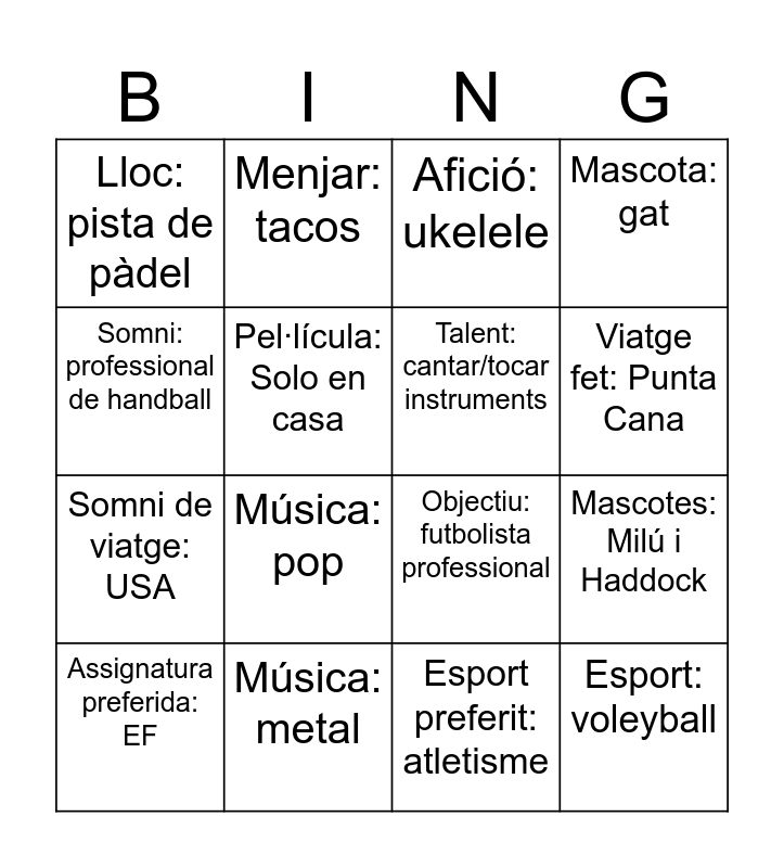 This bingo card has 16 words: Música: metal, Mascotes: Milú i Haddock, Afició: ukelele, Lloc: pista de pàdel, Somni de viatge: USA, Menjar: tacos, Objectiu: futbolista professional, Esport preferit: atletisme, Somni: professional de handball, Pel·lícula: Solo en casa, Assignatura preferida: EF, Mascota: gat, Música: pop, Viatge fet: Punta Cana, Talent: cantar/tocar instruments and Esport: voleyball.